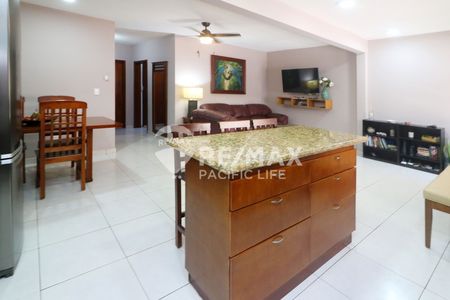Al entrar en el condominio de la planta baja, se percibe inmediatamente la sensación de amplitud que ofrecen sus espacios abiertos. La cocina, con barra de granito, muebles de