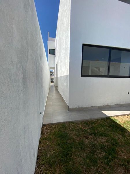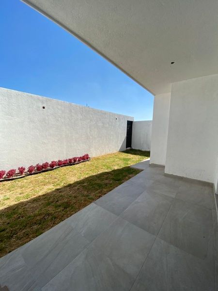 Sala, comedor, cocina, recámara con closet o estudio y baño completo, área de lavado, cuarto de servicio con baño Terraza con jardín, cochera para tres autos y pasillo lateral.