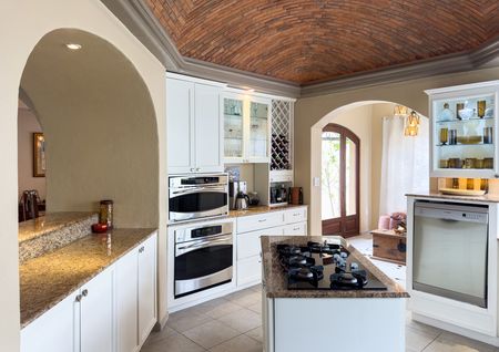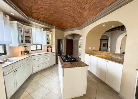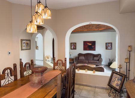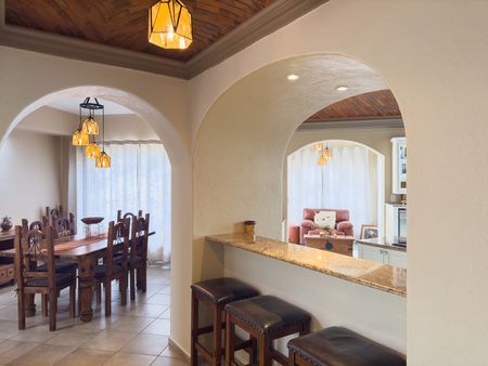 Al entrar a la casa, te dará la bienvenida la primera de las cinco hermosas y únicas bóvedas en la propiedad. Estos techos tienen iluminación perimetral para un brillo cálido y tenue, además de lámparas echas a la medida que se distribuyen en la primer planta.