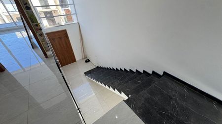 - Escalera de mármol con barandal de vidrio templado de 10 mm, revestida con huanacaxtle