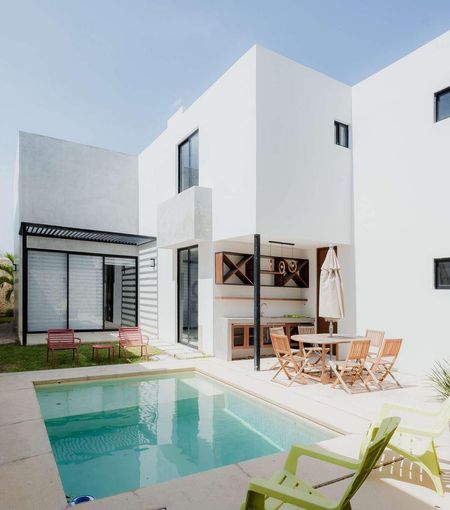 Alberca con área de asoleadero, espacio para jardín posterior y terraza apergolada
