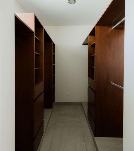 Recámara principal con área de closet vestidor y baño completo