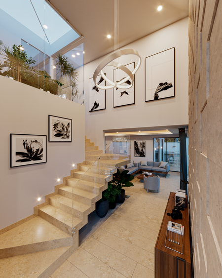• Vestíbulo recibidor doble altura con recubrimiento en piedra natural