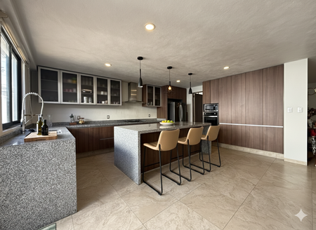 -Cocina equipada con barra desayunadora de granito, doble tarja, alacena, torre de hornos y parrilla
