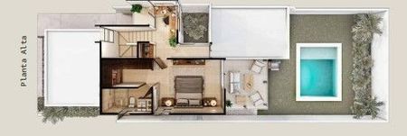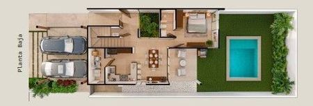 Planta Baja: comedor, cocina con alacena, medio baño para visitas, recámara con baño, jardín interior, terraza exterior, área de lavado, garage para dos vehículos.