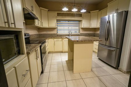 Moderna cocina equipada con estufa, microondas y refrigerador