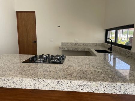 Cocina con meseta de granito, barra desayunador y gavetas inferiores