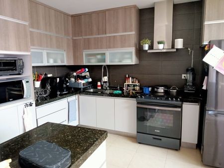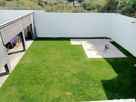 Planta baja. Sala, comedor, chimenea de gas, medio baño, cocina equipada muy amplia, jardín, área de lavado techada y cuarto de servicio con baño. La sala y la recámara principal cuentan con persianas automáticas.