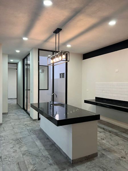 - Área de cocina con barra central,
