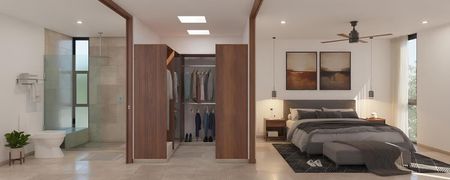 Recámara Principal con área para clóset vestidor y baño con doble lavamanos.