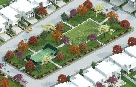 Privada residencial con un gran concepto minimalista y con paneles solares en toda la privada.