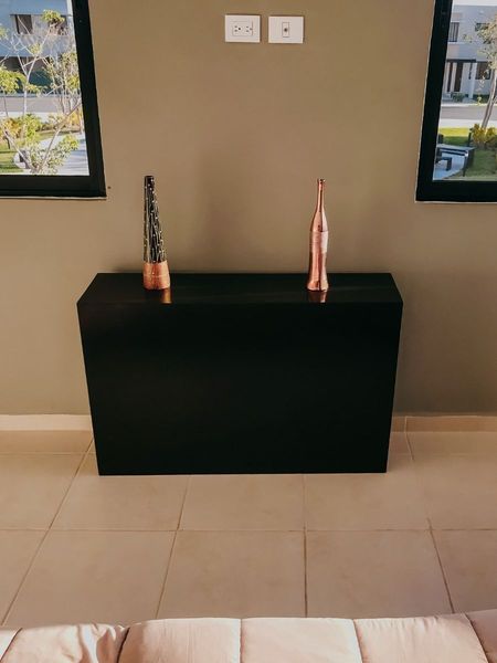 o Ventanería corrediza de aluminio anodizado negro y cristal transparente.