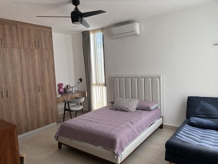 Recámara 1 con baño completo, espacio de closet vestido en carpintería de MDF color moscatto, con escritorio integrado y vista al jardín, terraza y alberca.