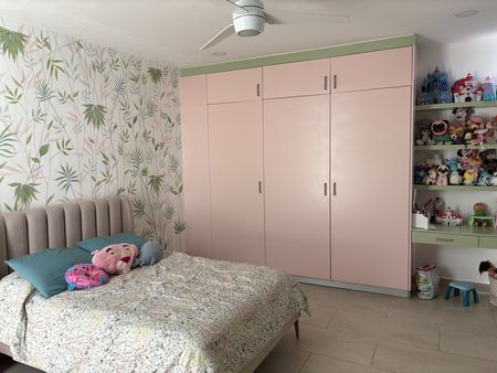 Recámara 2 con baño completo, espacio de closet vestido en carpintería de MDF colores rosa pastel y verde menta, con vista a jardines interiores.