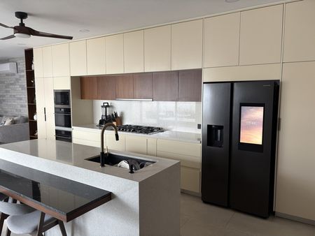 Cocina integral equipada, meseta de cuarzo color blanco estelar, gavetería en MDF color beige mate, puertas decorativas color madera en tzalam natural, mesa empotrada de multiplay de tzalam 18mm, con cubierta en granito vía láctea, de 2.40 m. de largo por 1 metro de ancho. Incluye línea blanca empotrada de la marca Teka: horno de microondas, horno mixto (convencional y microondas), horno convencional iOven, parrilla de 6 quemadores, campana oculta en carpintería, lavavajillas de 14 servicios, tarja de granito color negro. Cajones, especiero, gavetas, bote de basura doble oculto en la gavetería, todo con herrajes de cierre lento marca Blum.