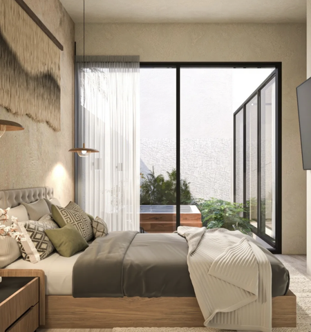 Recámara principal con vista a la terraza y la alberca, cuenta con área de clóset y baño completo