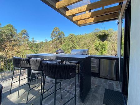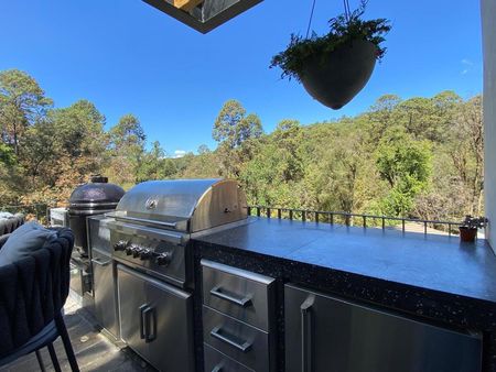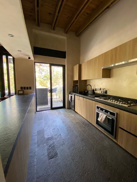 Las 4 recámaras, con baño propio, están orientadas hacia el arroyo. El diseño sofisticado incorpora granito, caliza y mármol, con elementos de madera, creando un estilo elegante. La propiedad tiene dos niveles de espacios acogedores, terraza amplia y piscina privada.