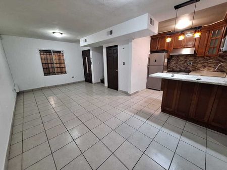 Planta baja con áreas de sala, comedor, cocina integral equipada, cuarto de televisión, cuarto de lavado y medio baño.