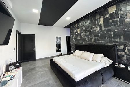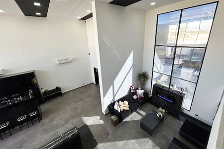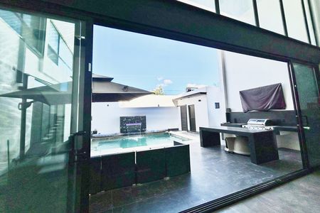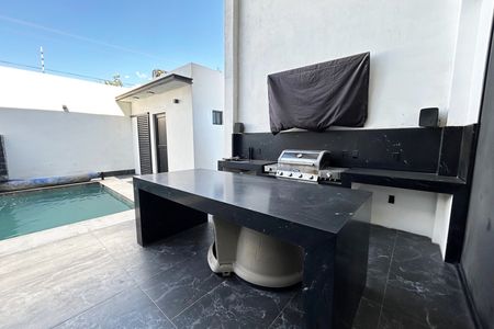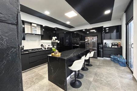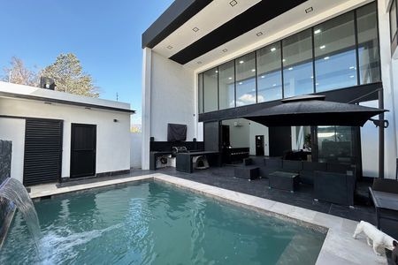 Planta Baja: Cuenta con vestíbulo y área social de doble altura (7 metros) que incluye sala, comedor y área de bar con enormes ventanales hacia la calle y área social exterior, cocina integral con cubierta de mármol con isla y alacena, recámara principal con walking closet, baño completo con regadera y tina de hidromasaje, lavandería, bodega y oficina, en la parte exterior terraza techada con asador, alberca de 6x4 con fuente, baño de visitas con placa de mármol, en el vestíbulo y baño exterior con regadera, cuarto de máquinas, pasillos laterales por ambos lados de la casa y cochera techada para 2 autos.