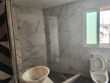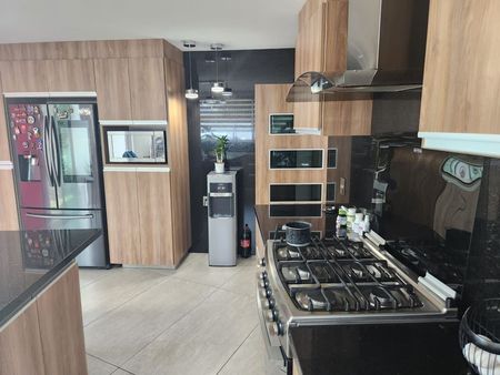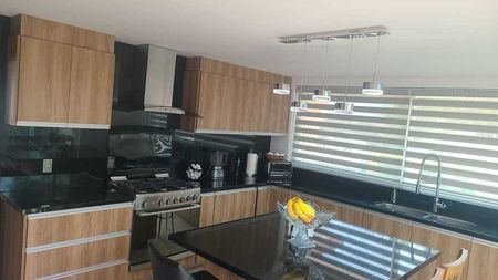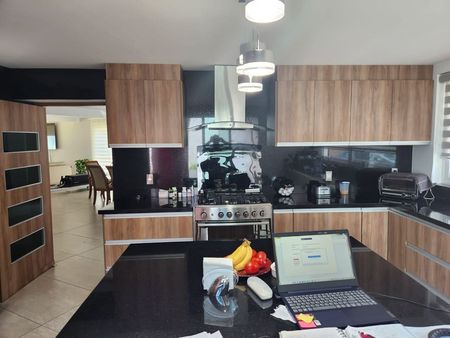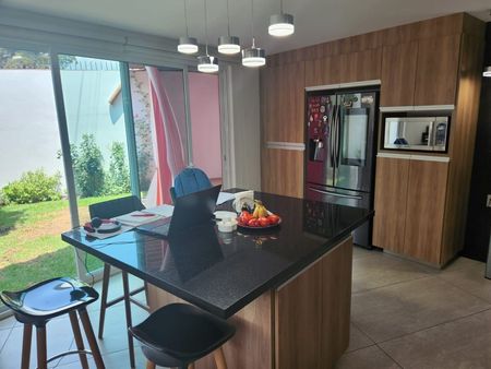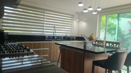 con cubierta de granito negro de una sola pieza, 3 recamaras con baño, la principal con vestidor, desayunador con terraza techada, cuarto servicio c/baño,cuarto de lavado, un jardín de buen tamaño, cabaña para fiestas, estacionamiento para 3 autos.