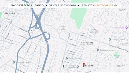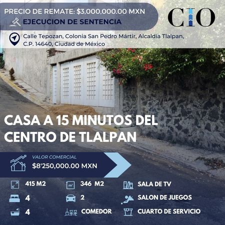 Casa en venta en San Pedro Mártir de Remate Bancario de 415 m2 de terreno, 346 m2 de construcción, 4 recámaras, sala de televisión o estudio, 3 baños, estancia – comedor, cocina, despensa, patio, bodega, jardín, 2 estacionamientos, 35 años de antigüedad. Para remodelar. Entrega de 10 a 12 meses aprox. Valor Comercial: $8,000,000.00 pesos. PRECIO DE REMATE BANCARIO: $2,700,000.00 PESOS. Pago directo al banco. Calle Tepozán, Colonia Ejidos de San Pedro Mártir, Alcaldía Tlalpan, C.P. 14640, CDMX. Los remates bancarios no se pueden ver por dentro ya que siguen habitados por los deudores y tampoco se pueden adquirir mediante créditos hipotecarios, solo con recursos propios. El tiempo de entrega depende del avance jurídico de cada asunto. Tenemos más de 250 inmuebles de recuperación bancaria. Solicita catálogo vía WhatsApp o una cita en nuestras oficinas al 56 3541-144 y 5559897315. Para más información y propiedades visita www.RematesHipotecarios.mx