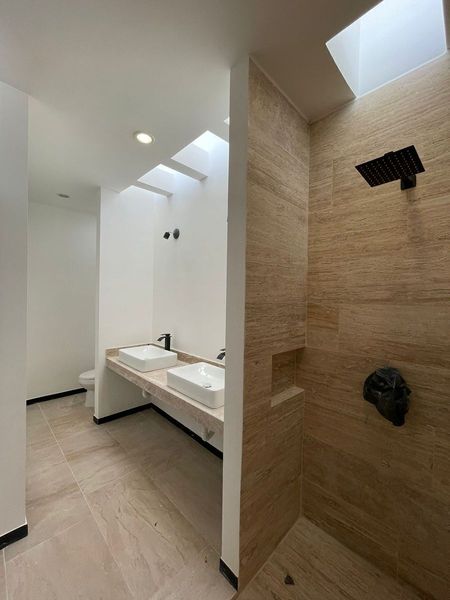 Recámara principal con doble lavabo en baño y amplio closet vestidor