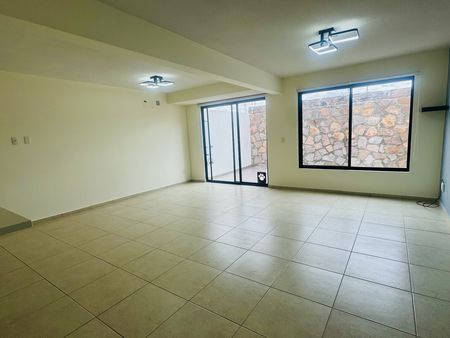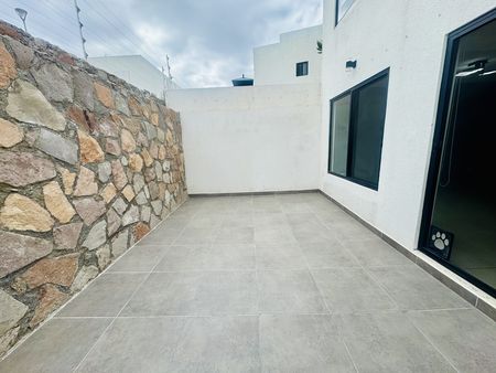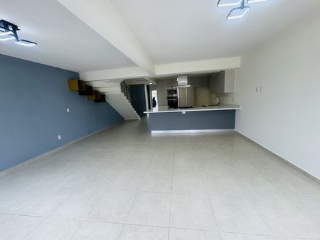 Estacionamiento para dos autos, medio baño de visitas, amplia cocina equipada de concepto abierto con barra de desayunador de granito y múltiples gabinetes de almacenaje, con acceso al área de lavado techada y cuarto de servicio. Sala-comedor con acceso a área de patio.