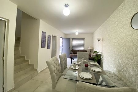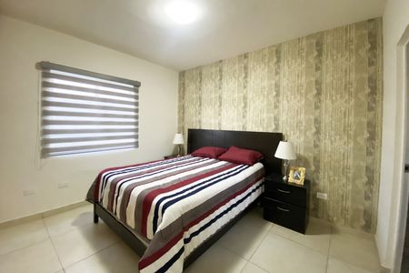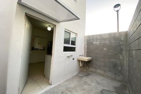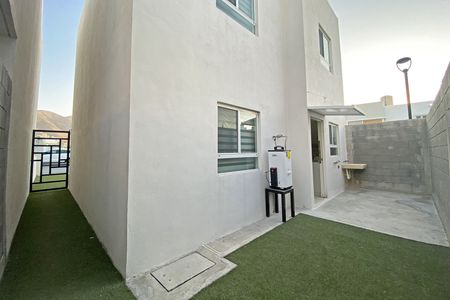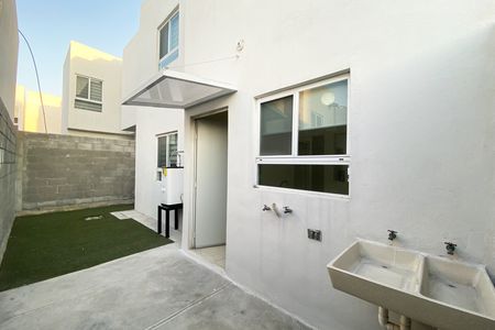 Planta Baja: Cochera descubierta para 1 auto, sala, comedor, medio baño, cocina integral, recámara con baño completo y closet, patio trasero con pasto sintético y área de servicio.