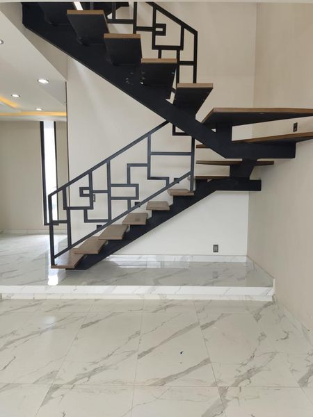 - Estructura de escalera de acero con escalones de rosa morada.