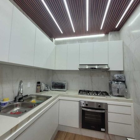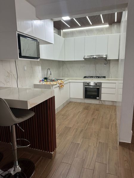 - Cocina equipada con cubiertas de loseta, doble tarja y espacio para horno tostador y microondas totalmente renovada