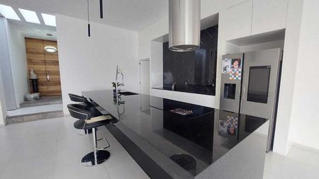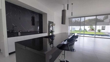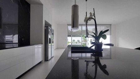 Cocina integral en concepto abierto, equipada con una moderna barra de mármol negro y amplias alacenas para almacenamiento. Perfecta para quienes disfrutan cocinar y socializar.