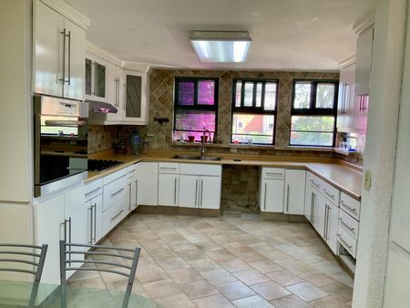 Desde la sala puedes ver el jardín, en la cocina recién remodelada con antecomedor, espacios bien distribuidos, gabinetes y cajones en madera blanca, área de despensa, iluminada de día con luz natura y por la noche con luz blanca.