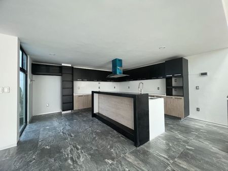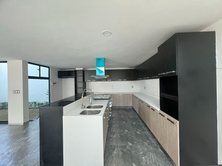 Es de concepto abierto y está equipada con estufa, campana y tarja de doble tina, sus cubiertas son de corian, tiene una barra desayunadora para 4 personas, cabe un refrigerador de tres puertas y tiene mucho espacio para almacenamiento.