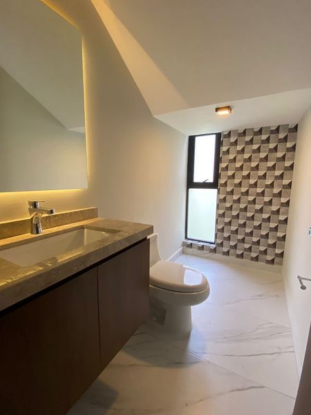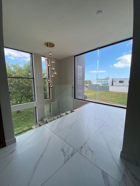 EQUIPAMIENTO. Cisterna con bomba sumergible y automático, tinaco, calentador de agua, barras de cocina de granito, barandales de cristal templado, tanque estacionario, instalaciones para lavadora y secadora, canceleria en baños de cristal templado, espejos de baño iluminados, lámpara colgante en cubo de escalera e interfón.