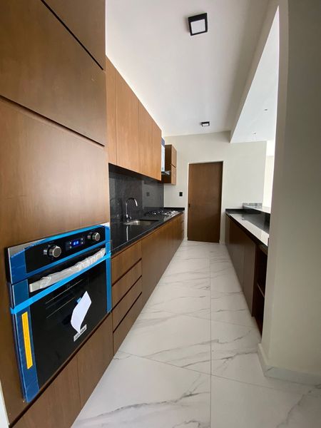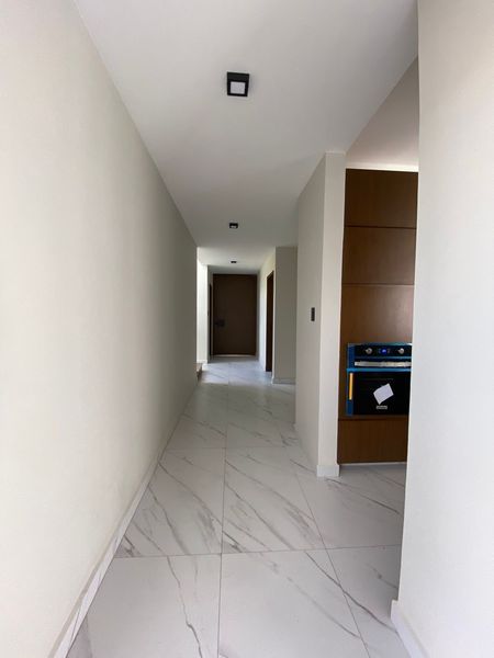 .B. Cochera para 2 autos con portón eléctrico, cocina integral, amplia alacena, sala-comedor climatizado, medio baño, cuarto de lavado, cuarto de servicio con baño, jardines, alberca