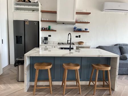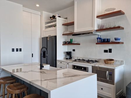 ·Cocina completamente equipada, gabinetes en madera de cedro, encimeras de cuarzo blanco.
