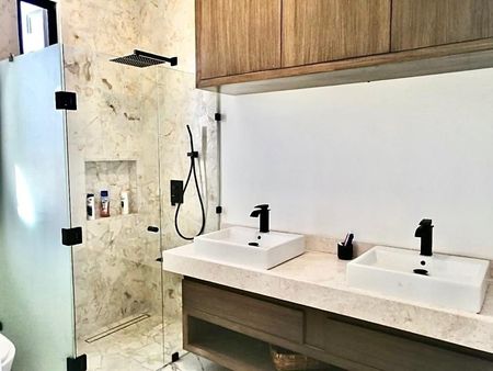 ·Recintos de ducha con incrustaciones piedra Crema Maya.