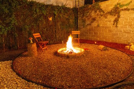 Jardín trasero plano 200mts con pasto, árboles y diseño de piedra de rio, fogatero, alumbrado