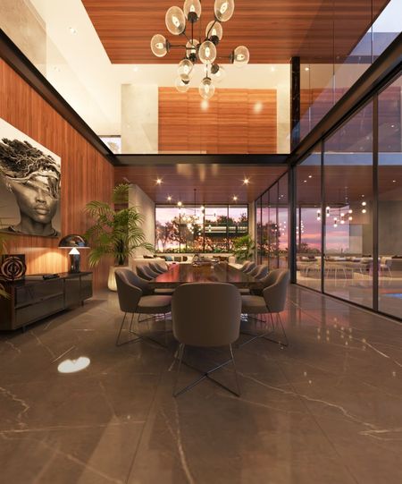 - Acabados de mármol de Importación y madera de cumarú o similar en muros