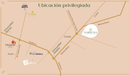 Se encuentra a menos de 15 minutos de la Universidad Marista, Modelo y Anáhuac Mayab, llegar a plazas como La Isla, The Harbor y Altabrisa así como el Hospital StarMédica te tomará unos 10 minutos, además se encuentra a unas cuadras del Periférico de Mérida con fácil acceso a desarrollos tanto comerciales como residenciales y la Carretera a Progreso desde donde en menos de 30 minutos podrás estar disfrutando de las hermosas costas yucatecas, definitivamente la mejor elección para tu nuevo hogar.