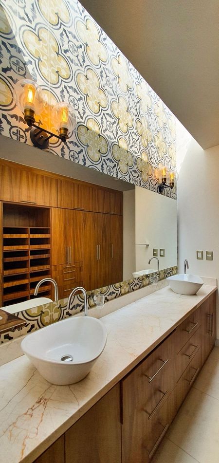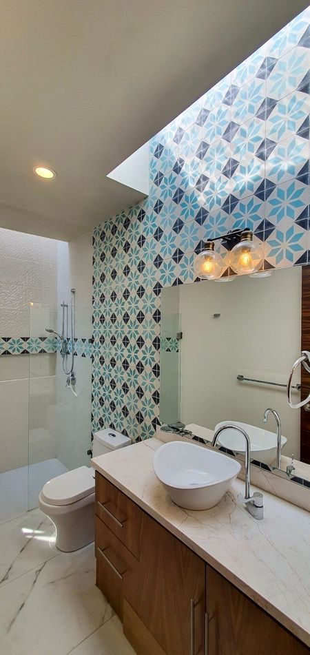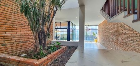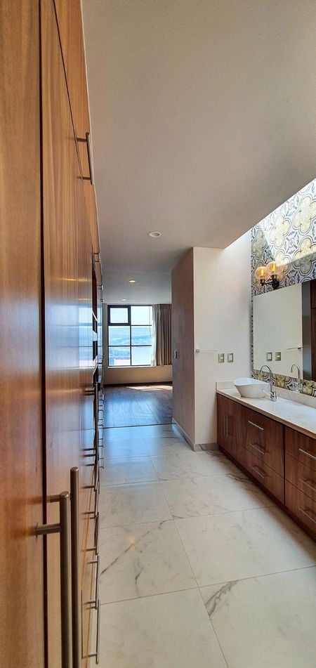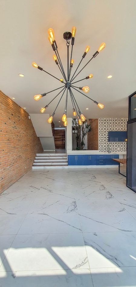 Cocina completamente equipada con campana, estufa, filtro de agua, horno, mesa de cocina de madera. Cuarto de lavado, árbol central inferior con jardinera y duomo eléctrico, espacio para sala y comedor, cuarto para estudio y/o ampliar 4a recámara, jardín y terraza totalmente equipada con bar de madera y persiana automática.