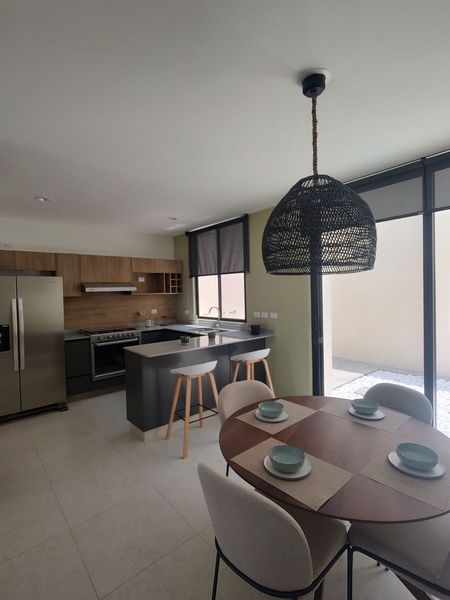 La casa se destaca por su amplitud en un concepto abierto, con techos de 2.70 metros de altura y amplios ventanales que le dan luminosidad. La cocina es de generosas dimensiones con cubiertas de granito y una amplia alacena. Además, cuenta con una bodega estratégicamente situada y un espacioso baño de visitas, lo que proporciona una sensación de amplitud y luminosidad.