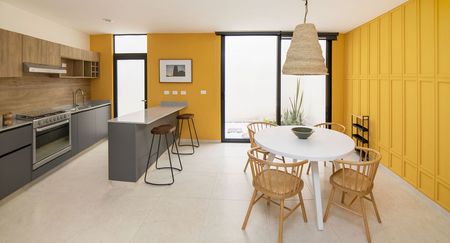 • Comedor con amplios ventanales que integran el interior con el patio trasero.