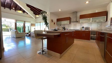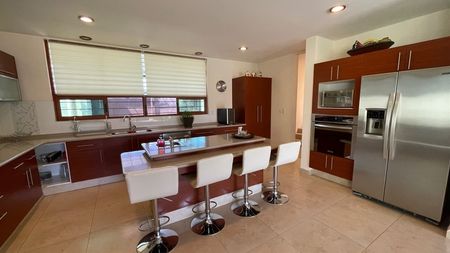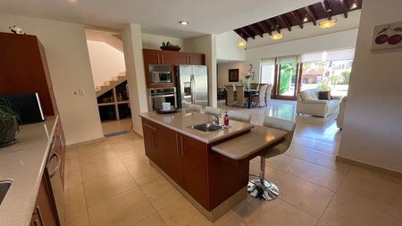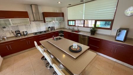 Área social: Recibidor con despacho privado ideal para trabajar desde casa. La sala, el comedor, la cocina integral equipada con isla y acabados de lujo, y el área de bar se integran en un solo ambiente abierto con vista directa al jardín y a una espectacular terraza. La alberca climatizada se convierte en el corazón de la propiedad, ideal para disfrutar todo el año.