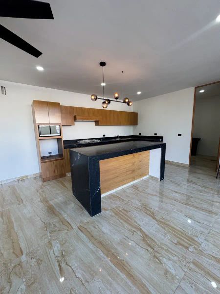 Cocina integral de lujo con isla en madera de tzalam, cubierta de granito