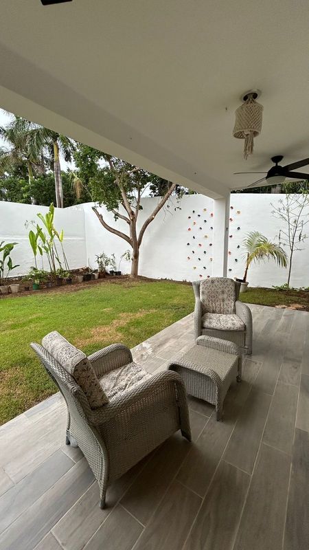 Terraza techada con piso cerámico imitación madera y dos ventiladores marca Hunter