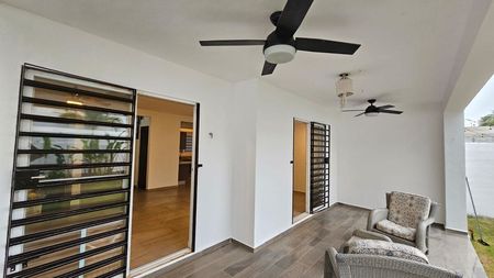 Terraza techada con piso cerámico imitación madera y dos ventiladores marca Hunter