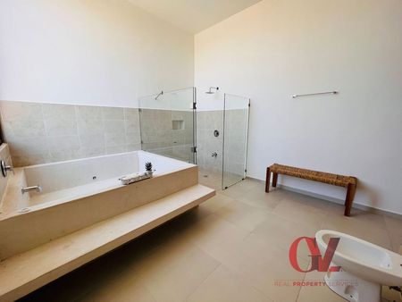 A la entrada de esta bella casa hay una terraza frontal casi a todo su ancho. Al ingresar podrás disfrutar de la amplitud que la sala- comedor ofrecen y mirar la terraza principal que conecta con el enorme jardín. La cocina es muy amplia que le cabe una mesa desayunadora, esta área esta conectada con cuarto de servicio y lavado. Tiene cuatro recámaras con baño y closet vestidor, puedo mencionar que el closet vestidor de la recámara principal es del tamaño de un cuarto mediano, además que el baño de la misma tiene doble lavabo y tina, además un espacio para oficina o estudio donde esta rodeado de varios ventanales, podría ser que es otra casa la recámara principal. El garage es techado para tres autos y fácilmente se pueden estacionar tres autos más.