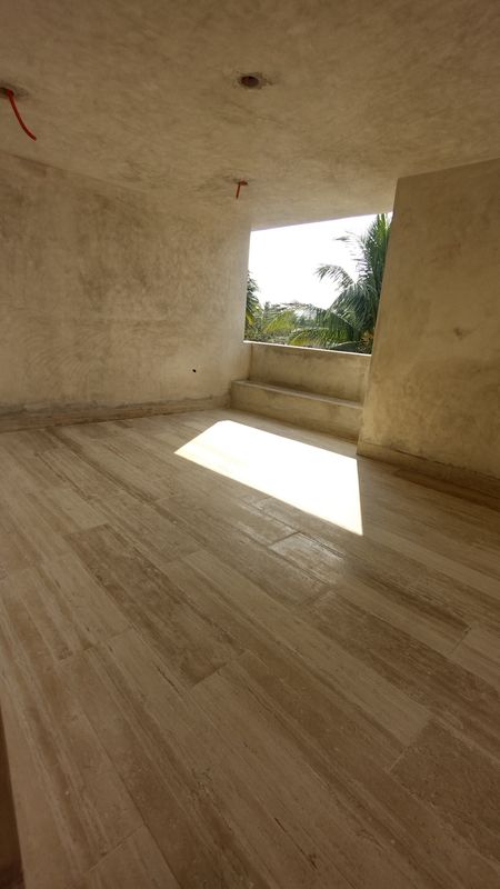 Acabados de lujo con piso de mármol travertino formato 30 cm por largo libre.