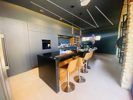 Cocina (con parrilla de gas y de inducción) con comedor integrado.